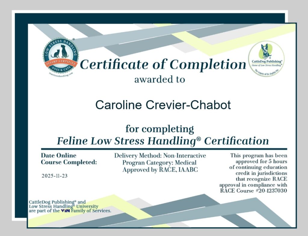 • Certification Cat Friendly Veterinary Advocate – American Association Feline Practitioners (2023)